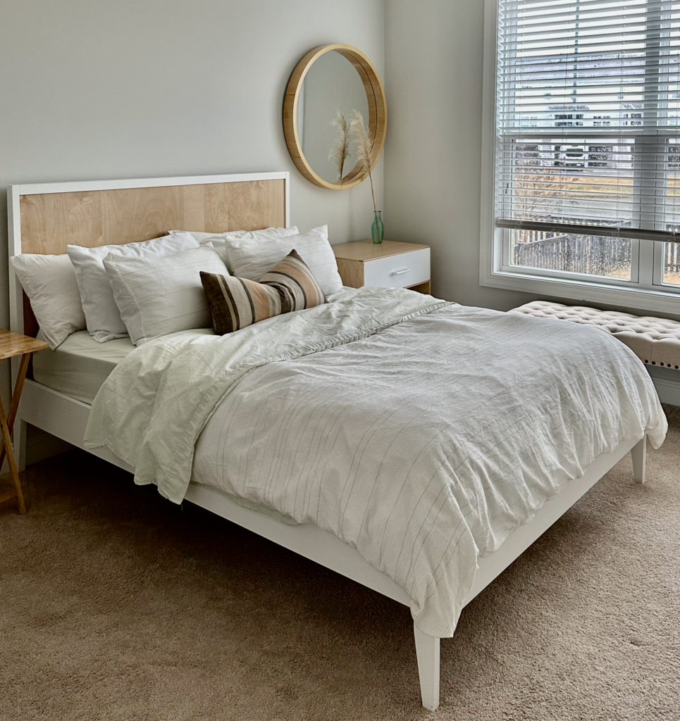 This steal from Plank and Beam is gorgeous. It has the same natural color with a white trim as the splurge. The only thing this steal is missing is the rattan. If you have kids, the rattan may be something you can do without. I personally love this option, it being wood instead of rattan makes it a little more durable. This is actually the bed I picked for our guest room and we absolutely love it. You get a designer look for a fraction of the cost. It is an all around win.