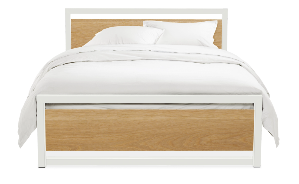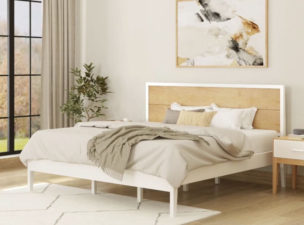 This bed comes with high reviews and a high price. It serves the look of the natural and white that I was looking for. This bed is made of steel instead of wood and has wood veneers glued onto the steel. It’s not for me but the reviews will say otherwise. This is a loved purchase by many. It has a low profile headboard and is very modern.